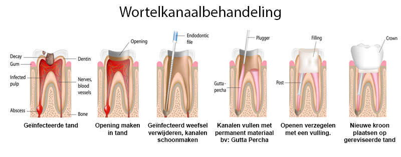 In sommige gevallen is er een wortelkanaalbehandeling nodig. Dit kan verschillende redenen hebben, waaronder een acute pijnklacht, maar soms kunt u zelf geen pijn voelen en is toch een wortelkanaalbehandeling nodig. Zo is soms op een röntgenfoto een zwarte vlek (ontsteking) rondom de wortelpunt te zien, terwijl u hier zelf (nog) geen last van heeft. De wortelkanaalbehandeling is er op gericht de bacteriën uit het wortelkanaal te verwijderen en natuurlijk om te voorkomen dat ze daar weer in binnendringen. Na het schoonmaken van de wortelkanalen zal de ontsteking rondom de wortelpunt kunnen genezen en het bot weer kunnen teruggroeien. Een wortelkanaalbehandeling wordt ook wel een endodontologische behandeling of kortweg endo genoemd. De behandeling vindt over het algemeen plaats onder verdoving en is zonder acute ontsteking bijna altijd pijnloos uit te voeren. De tandartsen bij Mondzorg Teakhout kunnen voor u bekijken of een wortelkanaalbehandeling noodzakelijk is en deze behandeling voor u uitvoeren. | ![]() |